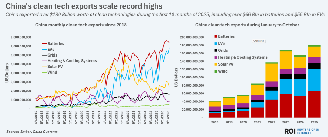 2025年前10個月,中國清潔技術(shù)出口總額超過1800億美元,其中包括逾660億美元的電池和約550億美元的電動車。電網(wǎng)設(shè)備、供暖與制冷設(shè)備的出口也在2025年創(chuàng)下新高,進(jìn)一步鞏固了中國作為全球電氣化硬件主要供應(yīng)國的地位。