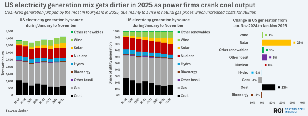 天然氣仍是美國最主要的電力來源,但在2025年,燃煤電廠發(fā)電量增幅最大,主要原因是天然氣價格飆升壓縮了公用事業(yè)利潤空間。由于天然氣價格上漲,2025年美國燃煤發(fā)電量創(chuàng)四年最大增幅,推高了公用事業(yè)成本。根據(jù)Ember數(shù)據(jù),2025年1月至11月,燃煤發(fā)電量同比增長13%,為三年來最高水平。由于燃煤電廠每兆瓦時排放二氧化碳超過90萬噸,遠(yuǎn)高于燃?xì)怆姀S的約55萬噸,因此美國電力行業(yè)的碳排放量在2025年也隨之上升。