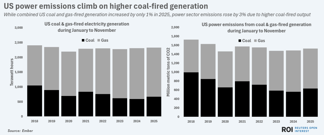 盡管2025年美國燃煤與燃?xì)夂嫌嫲l(fā)電量僅增長1%,但由于燃煤發(fā)電增加,電力行業(yè)碳排放上升了3%。Ember數(shù)據(jù)顯示,2025年1月至11月,燃煤與燃?xì)怆姀S合計排放二氧化碳達(dá)15.26億噸,比2024年同期增長3%,為2021年以來最高水平。鑒于美國天然氣價格預(yù)計到2025年底將比2024年平均水平高出約50%,公用事業(yè)公司可能會更加依賴成本更低的煤炭來滿足冬季用電需求。這意味著進(jìn)入2026年以后,電力行業(yè)的污染可能進(jìn)一步加劇。