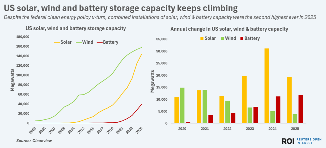 盡管2025年美國公用事業(yè)公司增加了燃煤發(fā)電,但它們也部署了創(chuàng)紀(jì)錄的電池儲能容量,以儲存多余的太陽能和風(fēng)能供后續(xù)使用。根據(jù)能源數(shù)據(jù)平臺Cleanview的數(shù)據(jù),2025年美國已安裝的電池儲能容量超過39吉瓦,較2024年增長43%。