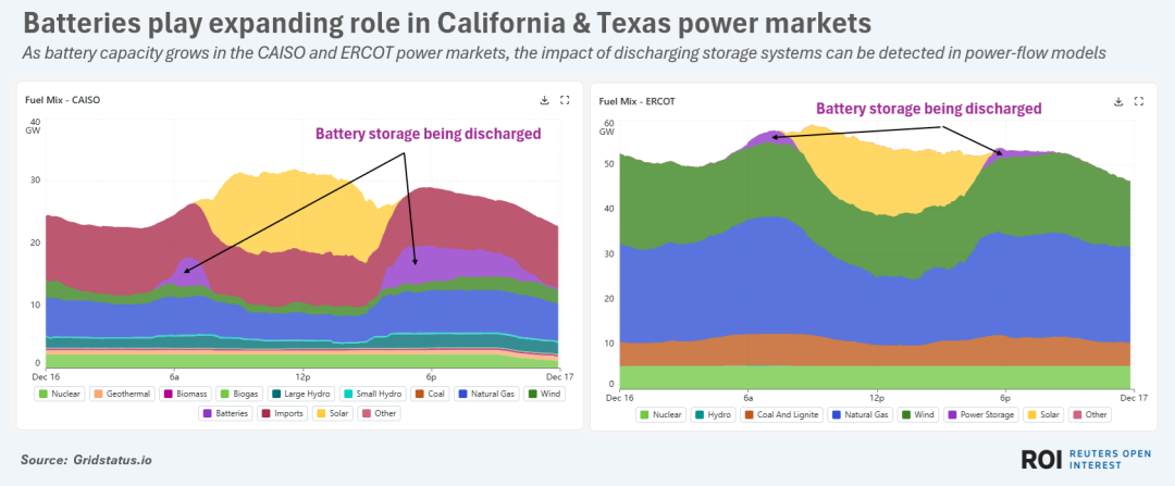 加州獨立系統(tǒng)運(yùn)營商(CAISO)——該州主要電網(wǎng)及全美最大的電池應(yīng)用方——在晚間高峰用電時段,電池供電比例已達(dá)15%至18%,減少了對天然氣等電源的依賴。在得克薩斯電力可靠性委員會(ERCOT)——一個較晚采用電池系統(tǒng)的地區(qū)——高峰負(fù)荷期間的電池供電比例約為3%,雖不算高,但相比一年前的接近零已有顯著提升。
