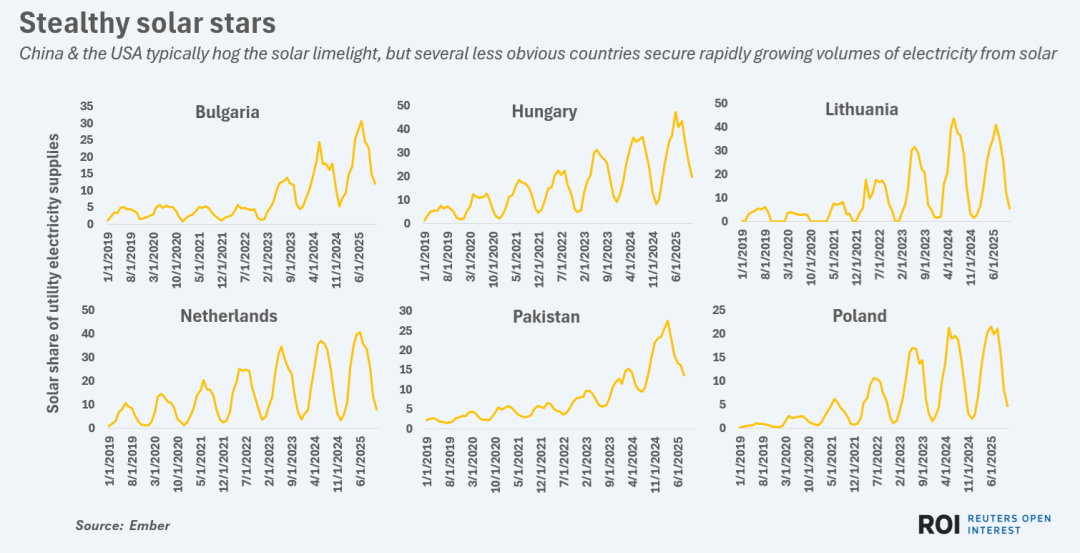 2025年某些時段,保加利亞、巴基斯坦、匈牙利和波蘭等國約20%或更多的電力來自太陽能發(fā)電場,既降低了成本又減少了排放。盡管中美通常主導(dǎo)太陽能話題,但多個“低調(diào)”國家正迅速提高來自太陽能的電力供應(yīng)比例。進(jìn)入2026年,預(yù)計更多國家將刷新太陽能發(fā)電占比紀(jì)錄,即使像美國這樣的主要經(jīng)濟(jì)體出現(xiàn)倒退,也有助于維持全球能源轉(zhuǎn)型的動力。