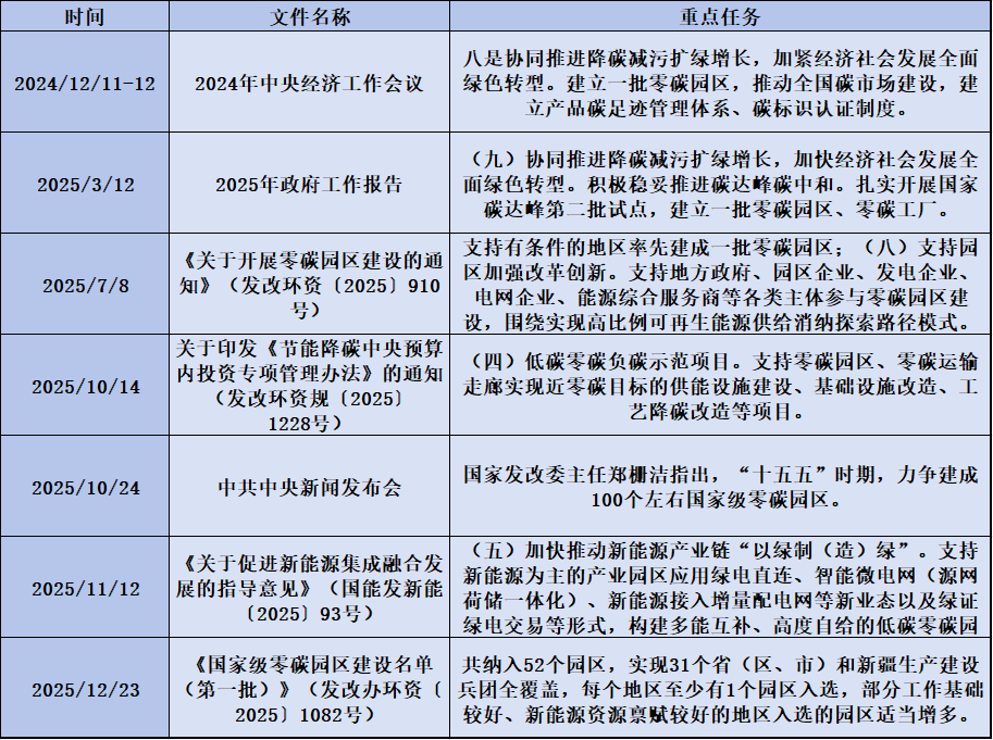 “十四五”以來,國家對零碳園區(qū)的支持力度顯著增強,政策體系日趨完善。2025年政府工作報告首次將“建立一批零碳園區(qū)”納入年度重點工作,標(biāo)志著零碳園區(qū)建設(shè)從行業(yè)探索上升至綠色轉(zhuǎn)型的重點任務(wù);2025年6月,“910號文”明確加快園區(qū)用能結(jié)構(gòu)轉(zhuǎn)型、大力推進園區(qū)節(jié)能降碳等八大重點任務(wù),為園區(qū)建設(shè)提供了清晰的“行動指南”。