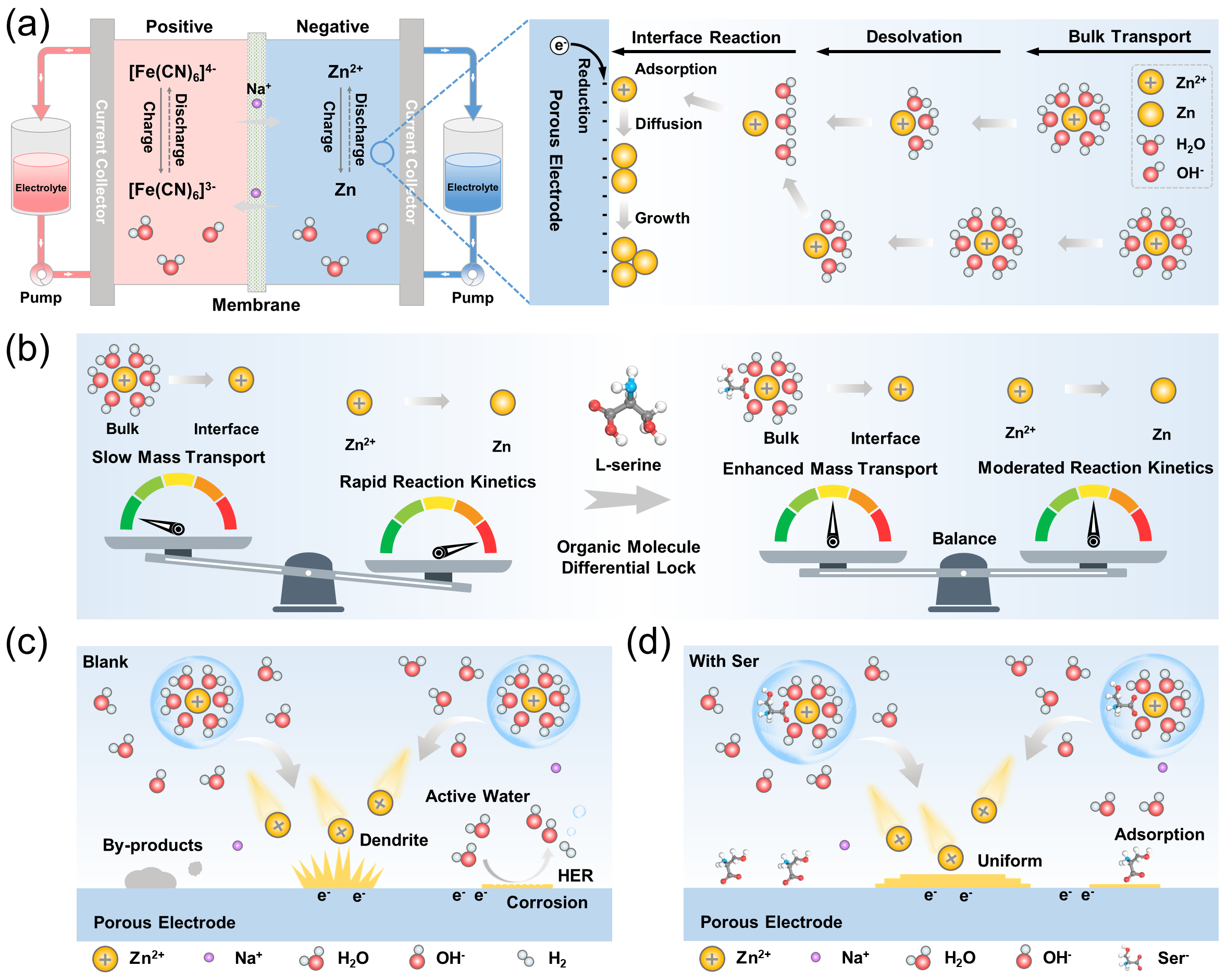 針對這一挑戰(zhàn),中國科學院院士、西安交通大學國家儲能技術產教融合創(chuàng)新平臺(中心)主任何雅玲,西安交通大學能源與動力工程學院李印實教授團隊創(chuàng)新性地提出了“有機分子差速鎖”概念。他們選用L-絲氨酸(Ser)作為多功能電解質添加劑,實現(xiàn)了對電解液體相和電極界面的分區(qū)精準調控。在體相電解液中,Ser重塑鋅離子溶劑化結構,提升了離子傳輸速率,同時其空間位阻效應適度減緩了反應動力學。在電極界面,Ser優(yōu)先吸附,引導鋅離子均勻沉積,抑制枝晶生長,并形成保護層以減輕副反應。