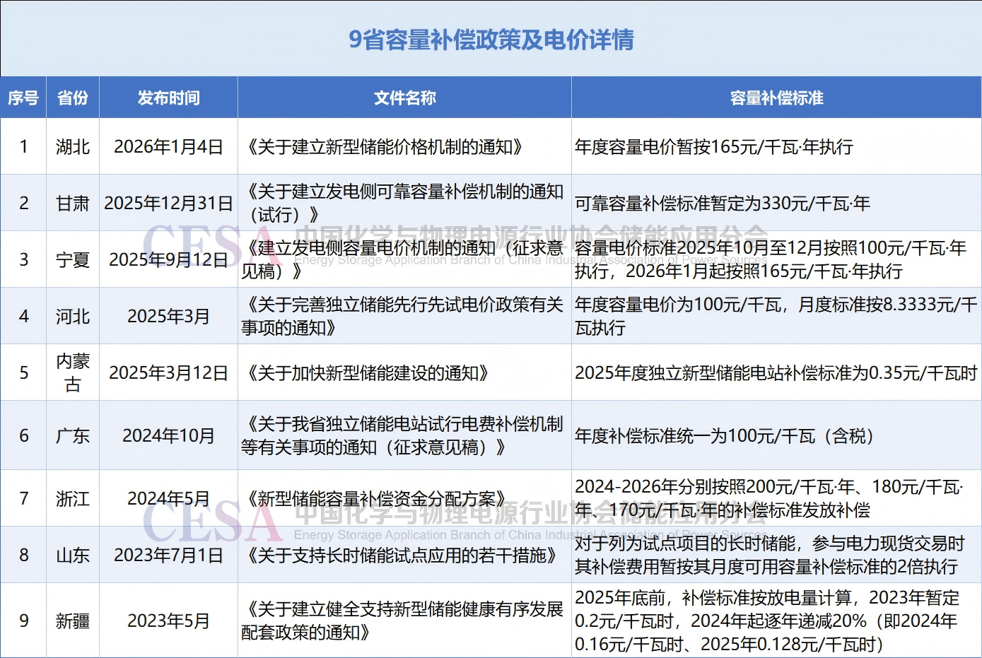 當前,我國正處于從各地探索“容量補償”向全國范圍建立統(tǒng)一、規(guī)范的“容量電價”機制過渡的關(guān)鍵階段。截至目前,全國已經(jīng)有包括湖北、甘肅、寧夏等9省公布了電網(wǎng)側(cè)獨立儲能容量補償政策及價格標準。