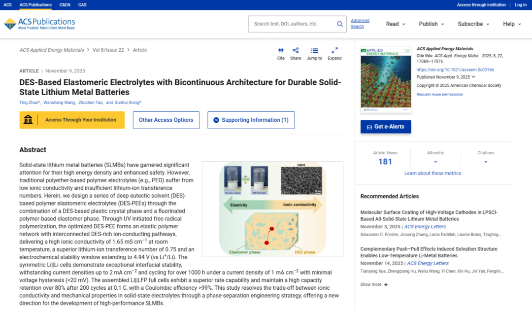 中國儲能網(wǎng)訊:近日,融捷能源在固態(tài)鋰金屬電池電解質(zhì)材料領(lǐng)域的研究取得重要進(jìn)展,相關(guān)成果發(fā)表于國際知名期刊《ACS Applied Energy Materials》。該研究以融捷能源作為第一完成單位,在王萬勝博士的帶領(lǐng)下,由趙婷博士(在站博士后,論文第一作者兼通訊作者)、陶柱晨博士等組成的核心研發(fā)團(tuán)隊(duì),聯(lián)合華南理工大學(xué)熊訓(xùn)輝教授共同完成。圍繞這一核心結(jié)構(gòu)設(shè)計(jì)、關(guān)鍵材料配方及制備工藝,我司已提交并獲受理多項(xiàng)國家發(fā)明專利,標(biāo)志著公司在固態(tài)電池核心材料領(lǐng)域的研發(fā)實(shí)力獲得國際學(xué)術(shù)認(rèn)可與知識產(chǎn)權(quán)保護(hù)雙重加持。
