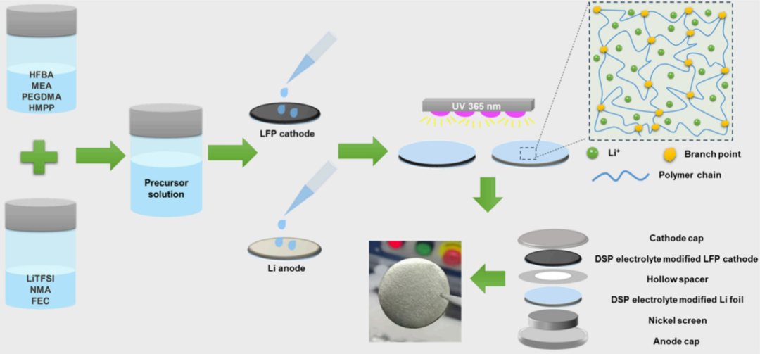 針對這一難題,融捷能源研發(fā)團(tuán)隊(duì)獨(dú)辟蹊徑,創(chuàng)新性地將低共熔溶劑(DES)的高離子傳輸特性與帶醚鍵的含氟聚合物的優(yōu)異機(jī)械性能、化學(xué)穩(wěn)定性相結(jié)合,通過原位紫外引發(fā)自由基聚合技術(shù),構(gòu)建出具有“雙連續(xù)相分離結(jié)構(gòu)”的DES基聚合物電解質(zhì)(DES-PEEs)。該結(jié)構(gòu)由相互貫穿、各自連續(xù)的兩套網(wǎng)絡(luò)組成。一套是富含DES的“離子高速公路”,專司鋰離子的快速傳輸;另一套是由氟化彈性體構(gòu)成的“力學(xué)骨架”,為整個(gè)電解質(zhì)提供柔韌的機(jī)械支撐和尺寸穩(wěn)定性。兩套網(wǎng)絡(luò)在三維空間上彼此交織、互不干擾,從根本上解決了“離子電導(dǎo)率”與“機(jī)械性能”難以兼顧的行業(yè)痛點(diǎn)。