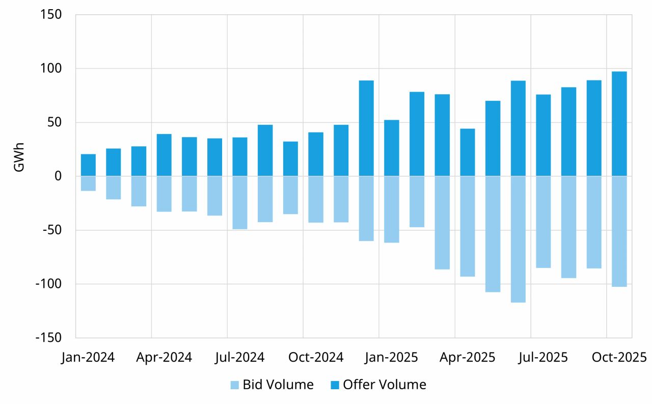 進(jìn)入2025年下半年,平衡機(jī)制的成交量似乎趨于穩(wěn)定,或至少增長(zhǎng)有所放緩。這與某些平衡機(jī)制動(dòng)作天生不太適合BESS有關(guān),例如需要非持續(xù)時(shí)間限制資產(chǎn)參與的較長(zhǎng)時(shí)(>2小時(shí))動(dòng)作。