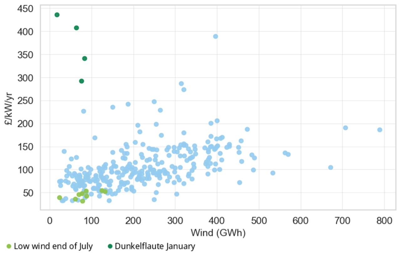 2025年1月,"暗無風(fēng)"(Dunkelflaute)天氣與緊張的備用裕度共同推高了電價(jià)差,帶來了極高的BESS收入。但在7月下旬,類似的低風(fēng)速條件恰逢更寬松的系統(tǒng)裕度,且邊際發(fā)電多為燃?xì)獍l(fā)電,抑制了價(jià)格波動(dòng),導(dǎo)致收入大幅降低。更多細(xì)節(jié)可參閱《今夏英國(guó)BESS收入從約90英鎊/千瓦降至約55英鎊/千瓦》。