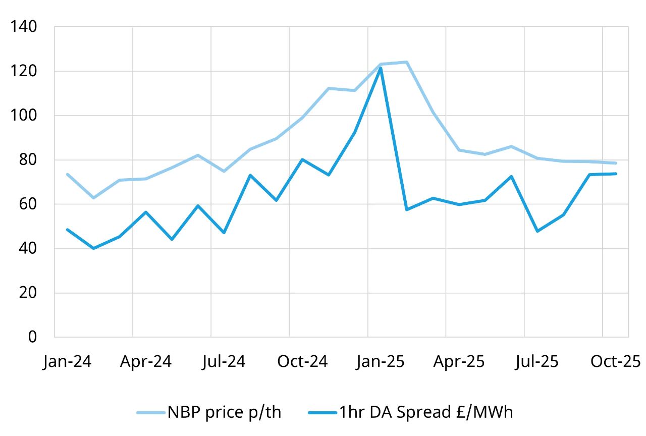 圖表4說明了天然氣價(jià)格如何繼續(xù)錨定1小時(shí)日前電價(jià)差,2025年相對(duì)2024年上半年觀察到的更高電價(jià)差,其驅(qū)動(dòng)因素之一便是更高的天然氣價(jià)格。