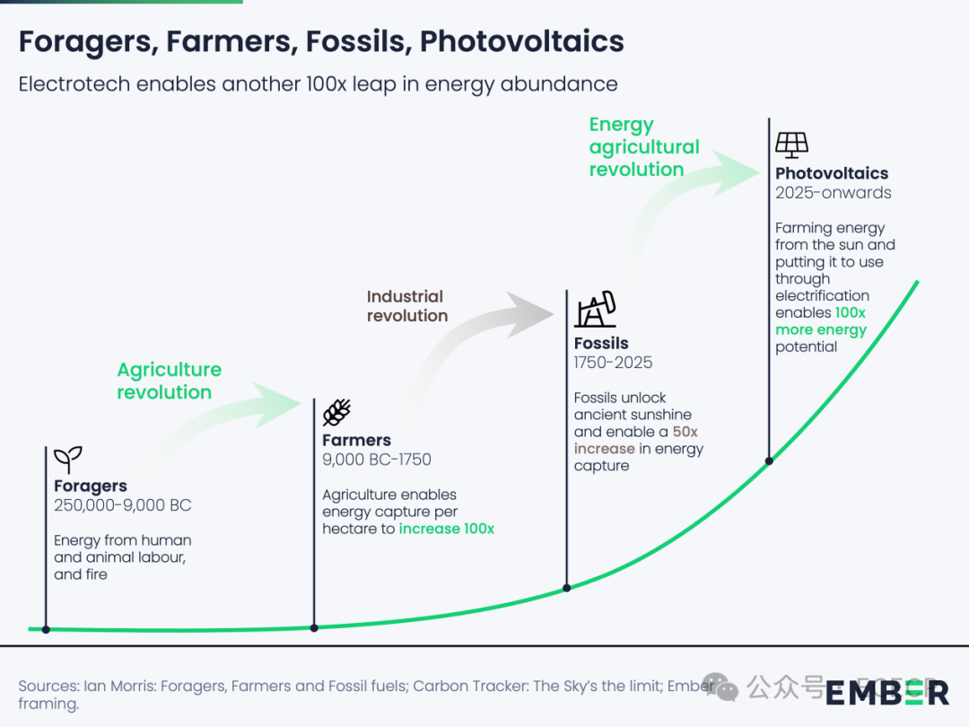 一場類似的革命正在能源領(lǐng)域悄然上演。從四處追尋和收集化石燃料,轉(zhuǎn)向就地“耕種”風(fēng)、光、水、熱 —— 我們正在解鎖一個更本地化、更穩(wěn)定且規(guī)模更加龐大的資源庫,能夠提供比化石燃料多幾個數(shù)量級的能源資源,每個國家坐擁的可再生資源至少是其需求的十倍,甚至是上千倍。隨著可再生能源發(fā)電規(guī)模的擴大和電氣化的普及,我們將迎來一個能源極大富足的新時代。