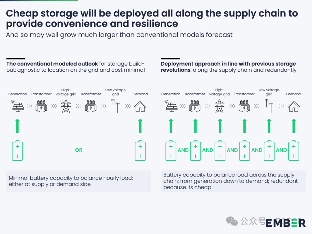 從來沒有人計算過全球所需冰箱存儲空間的“成本最優(yōu)最小尺寸”究竟是多少。一旦冷藏技術(shù)變得經(jīng)濟實惠,企業(yè)和家庭便開始購置冰箱,以獲得更大的靈活性和安心感,并將其部署到供應(yīng)鏈的各個環(huán)節(jié),從農(nóng)場、配送中心,到超市和居民家中。同樣的邏輯也適用于電池。隨著成本下降,電池將無處不在:太陽能電站、變電站、工廠和千家萬戶,而不僅僅是那些“必需”的場所。