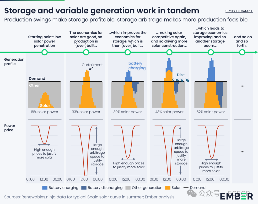 同樣的反饋循環(huán)正在電力行業(yè)形成。太陽能發(fā)電規(guī)模擴大時,午間電價下跌,為電池儲能創(chuàng)造了獲利空間,使其具備盈利能力。電池儲能系統(tǒng)建成后,又會再次平抑電價,為更多太陽能發(fā)電項目鋪路。與此同時,隨著太陽能和電池的規(guī)?;l(fā)展,其自身的成本持續(xù)下降,這意味著它們能夠在價格逐步降低且套利空間更小的情況下繼續(xù)蓬勃發(fā)展。儲能與發(fā)電相輔相成,互相促進,每一次擴張都為下一次增長創(chuàng)造條件。若單獨審視儲能或發(fā)電的經(jīng)濟邏輯,似乎會得出“相互蠶食”的結(jié)論,但實際上,這是波動性供給與儲能之間的協(xié)同共贏。