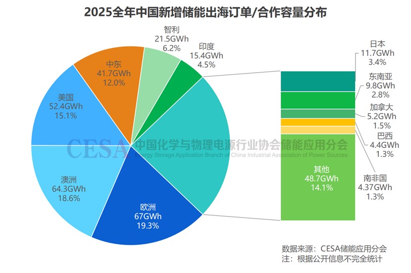 2025年的儲(chǔ)能出海,并非單一市場(chǎng)拉動(dòng),而是多區(qū)域同時(shí)放量。據(jù)CESA儲(chǔ)能應(yīng)用分會(huì)數(shù)據(jù)庫(kù)不完全統(tǒng)計(jì),2025年中國(guó)企業(yè)新增儲(chǔ)能出海訂單及合作規(guī)模高達(dá)353GWh,同比增長(zhǎng) 94%。其中,儲(chǔ)能EPC(含設(shè)備)、儲(chǔ)能系統(tǒng)和儲(chǔ)能電池合計(jì) 346GWh,同比增長(zhǎng) 90%。