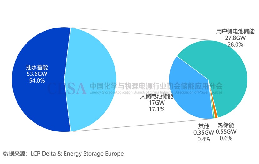 據(jù)LCP Delta 和 Energy Storage Europe(前身為歐洲儲(chǔ)能協(xié)會(huì),EASE)最新數(shù)據(jù)顯示,截至2025年11月1日,歐洲儲(chǔ)能累計(jì)裝機(jī)已達(dá)到99.3GW。其中,電池儲(chǔ)能系統(tǒng)(主要是鋰離子電池)累計(jì)裝機(jī)高達(dá)44.8GW,占比高達(dá)45.1%,作為主要增長(zhǎng)點(diǎn),到2026年下半年,歐洲電池儲(chǔ)能累計(jì)裝機(jī)將超過抽水蓄能。