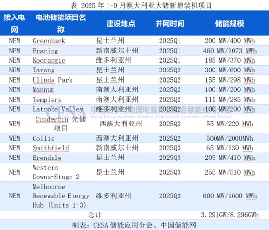 澳大利亞能源市場(chǎng)運(yùn)營(yíng)商(AEMO)和CESA儲(chǔ)能應(yīng)用分會(huì)數(shù)據(jù)顯示,2025年前三季度,澳大利亞新增裝機(jī)14個(gè)大儲(chǔ)項(xiàng)目,大儲(chǔ)新增裝機(jī)規(guī)模3.291GW/8.296GWh,超過往年的總和。截至2025年9月底,澳大利亞電池大儲(chǔ)累計(jì)裝機(jī)達(dá)6.3GW/13.1GWh。