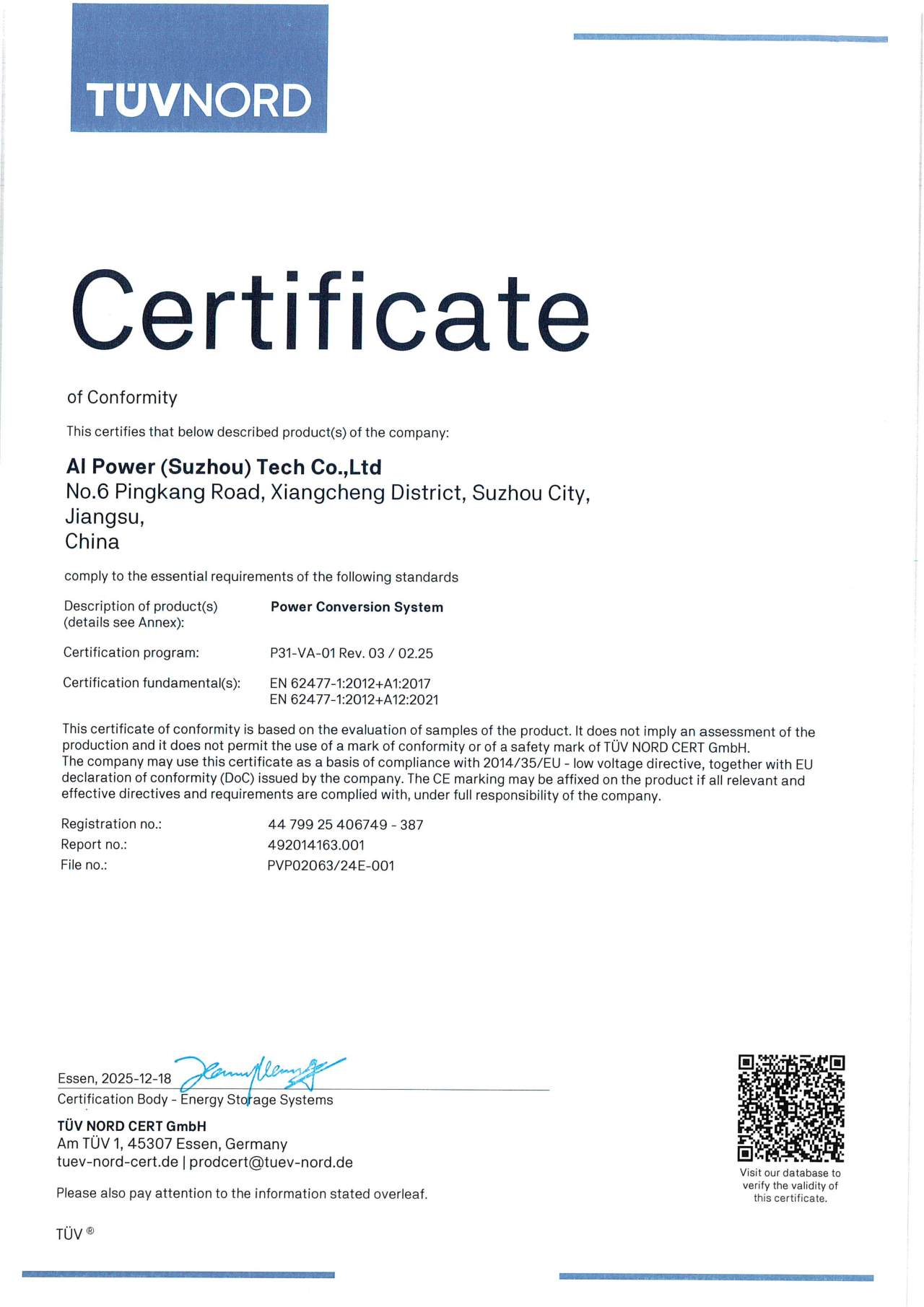 中國(guó)儲(chǔ)能網(wǎng)訊:近期,蘇州鈞灝電力有限公司(以下簡(jiǎn)稱“鈞灝電力”)AIPS-100A構(gòu)網(wǎng)型儲(chǔ)能變流器榮膺TUV認(rèn)證。這是繼 AIPS-30/50A ,AIPS-630/1250A順利通過(guò)認(rèn)證后,鈞灝電力構(gòu)網(wǎng)型PCS產(chǎn)品再傳捷報(bào)。這是一份基于IEC國(guó)際安全規(guī)范的權(quán)威性能鑒定報(bào)告。它標(biāo)志著蘇州鈞灝系列構(gòu)網(wǎng)型PCS產(chǎn)品在極限條件下,成功通過(guò)了從硬件到軟件系統(tǒng)可靠性驗(yàn)證,在安全、效能與構(gòu)網(wǎng)適應(yīng)性三個(gè)維度均達(dá)到了國(guó)際一流水準(zhǔn),也標(biāo)志著蘇州鈞灝組串式的PCS從30KW/50KW/100KW/125KW的DCAC交流和DCDC直流產(chǎn)品系列更進(jìn)一步豐富了。