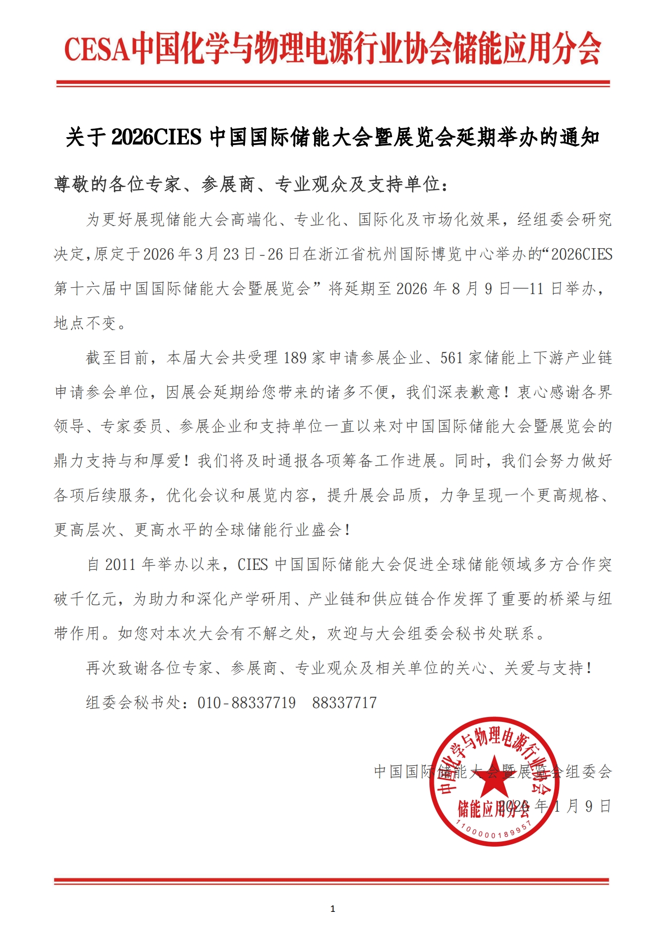 為更好展現(xiàn)儲能大會高端化、專業(yè)化、國際化及市場化效果,經(jīng)組委會研究決定,原定于2026年3月23日-26日在浙江省杭州國際博覽中心舉辦的“2026CIES第十六屆中國國際儲能大會暨展覽會”將延期至2026年8月9日—11日舉辦,地點不變。