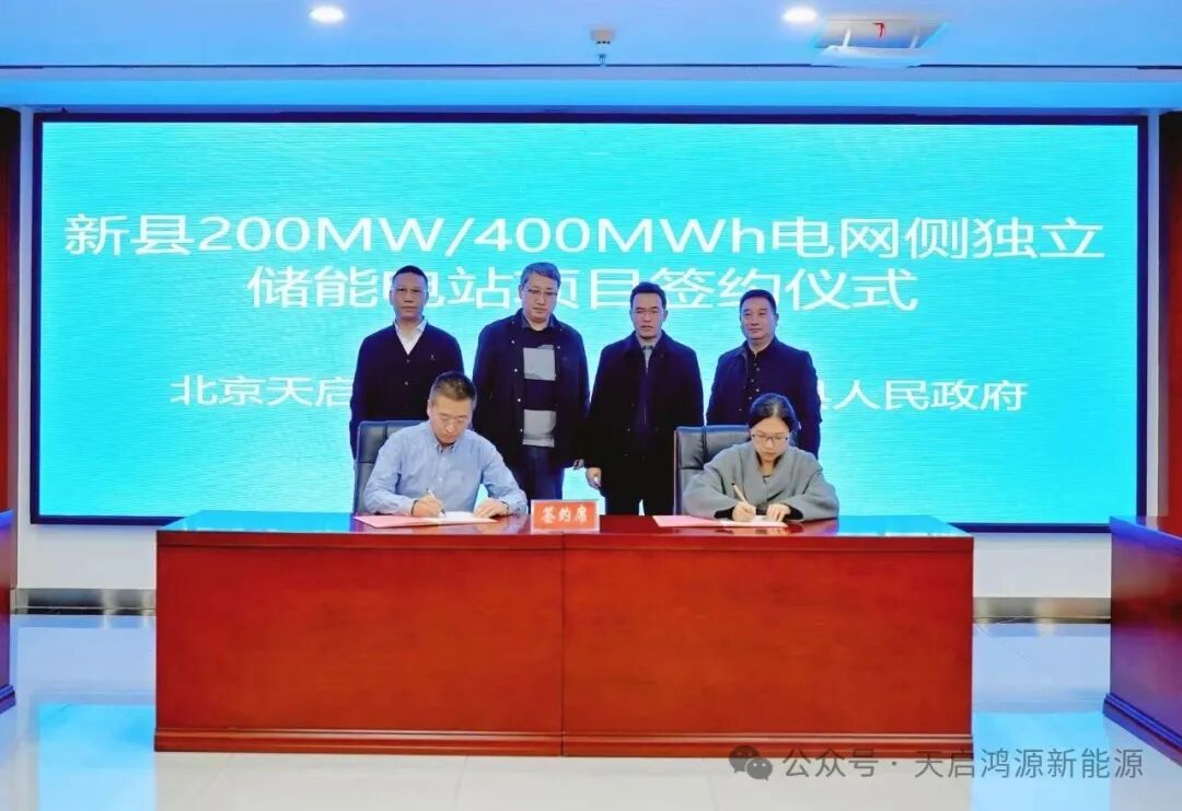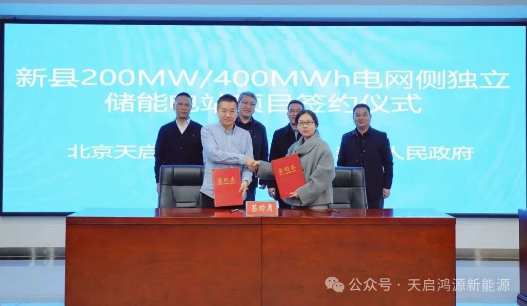 在與會領導的共同見證下,新縣人民政府副縣長李勍與天啟鴻源公司代表、儲能事業(yè)部總經理楊繼強正式簽署合作協(xié)議。