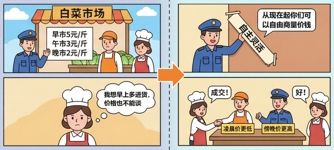 現(xiàn)在,市場管理員說“我不再硬性規(guī)定什么時(shí)候高價(jià)、什么時(shí)候低價(jià)了。你們買賣雙方自己談,按不同時(shí)段分別定價(jià)交易”。因此,例如某個(gè)飯店主要在凌晨采購白菜,而此時(shí)正好是某位菜販?zhǔn)卟斯?yīng)充足的時(shí)段,雙方即可協(xié)商形成一個(gè)更低的交易價(jià)格,實(shí)現(xiàn)供需匹配和互利共贏。