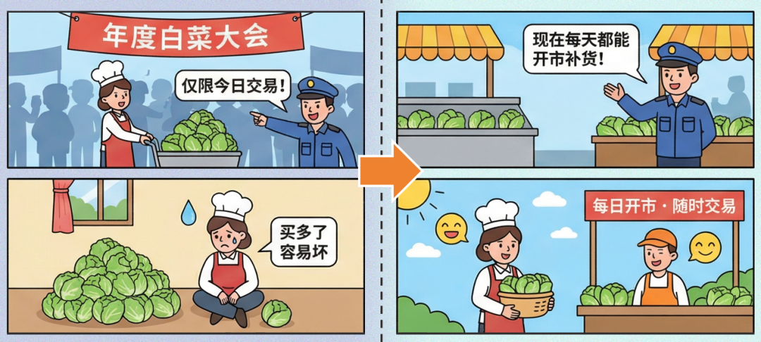 在此之前,電力中長期交易側(cè)重于年度和月度交易,交易安排更像是菜市場里的“定期趕大集”。一年只在年初集中開一次年度大集,月度交易也往往僅限于每月初固定開市,飯店和菜販必須在年度和月度大集上把未來的白菜買賣談妥。如果飯店在兩次“大集”之間需要調(diào)整進(jìn)貨計(jì)劃,通常缺乏靈活補(bǔ)單的渠道,只能轉(zhuǎn)向當(dāng)天市場采購,被動(dòng)承擔(dān)更大的價(jià)格波動(dòng)風(fēng)險(xiǎn)。