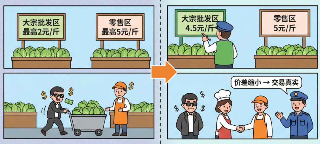 現(xiàn)在,市場管理者認(rèn)識(shí)到這一問題,并推出新規(guī):“將逐步調(diào)整批發(fā)區(qū),特別是月內(nèi)批發(fā)的最高限價(jià),向零售區(qū)的最高限價(jià)靠攏”。例如,將原本2元/斤的批發(fā)限價(jià)逐步提高至4.5元/斤,這意味著,兩個(gè)交易區(qū)域的價(jià)格“天花板”將逐漸對齊。當(dāng)價(jià)差被縮小后,白菜批發(fā)合同的性質(zhì)也隨之發(fā)生變化,開始真正承擔(dān)起提前發(fā)現(xiàn)價(jià)格、穩(wěn)定預(yù)期的功能。菜販看到批發(fā)價(jià)與零售價(jià)銜接順暢,敢提前規(guī)劃明年種多少白菜;飯店看到長期價(jià)格不再與當(dāng)天價(jià)格嚴(yán)重脫節(jié),也更愿意提前鎖定采購量。最終,白菜價(jià)格既穩(wěn)得住,又調(diào)得動(dòng),整個(gè)菜市場運(yùn)行得更順暢。