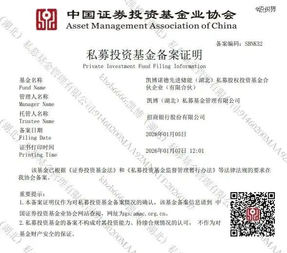 中國儲能網(wǎng)訊:投資界1月12日消息,近日,凱博資本擔(dān)任基金管理人的凱博諾德先進(jìn)儲能(湖北)私募股權(quán)投資基金合伙企業(yè)(有限合伙)(簡稱“凱博諾德儲能基金”、“基金”),順利完成中國基金業(yè)協(xié)會備案。凱博諾德儲能基金由凱博資本、中創(chuàng)新航(3931.HK)旗下中創(chuàng)新航智慧能源科技有限公司、諾德股份(600110.SH)旗下深圳諾德智慧鑫創(chuàng)能源有限公司、惠州諾德晟世新能源有限公司共同發(fā)起設(shè)立,基金首期規(guī)模為4億元,重點投向獨立儲能、工商業(yè)儲能、光儲充零碳園區(qū)項目以及優(yōu)質(zhì)儲能股權(quán)項目。