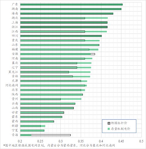 對(duì)于存量項(xiàng)目機(jī)制電價(jià),各地普遍對(duì)標(biāo)當(dāng)?shù)厝济夯鶞?zhǔn)價(jià),保障平穩(wěn)過渡。存量項(xiàng)目機(jī)制電價(jià)整體處于0.26-0.45元/千瓦時(shí)之間,平均值為0.364元/千瓦時(shí)(各省存量項(xiàng)目機(jī)制電價(jià)與燃煤基準(zhǔn)價(jià)見圖1)。東部沿海地區(qū)、珠三角地區(qū)和中部部分地區(qū)的價(jià)格水平普遍較高,處于0.38-0.45元/千瓦時(shí)之間,其中湖南、廣東最高,分別為0.45、0.453元/千瓦時(shí)。而資源較好但用電需求較低的西北區(qū)域機(jī)制電價(jià)水平明顯低于其他地區(qū),處在0.22-0.30元/千瓦時(shí)之間。全國12地的存量項(xiàng)目機(jī)制電價(jià)高于當(dāng)?shù)厝济夯鶞?zhǔn)價(jià),其中貴州價(jià)差最大達(dá)+17.2%;僅安徽、青海兩地存量項(xiàng)目機(jī)制電價(jià)低于當(dāng)?shù)厝济夯鶞?zhǔn)價(jià),青海0.227元/千瓦時(shí)的價(jià)格水平不僅為全國最低,低于燃煤基準(zhǔn)價(jià)30.1%的價(jià)差也是全國首位。