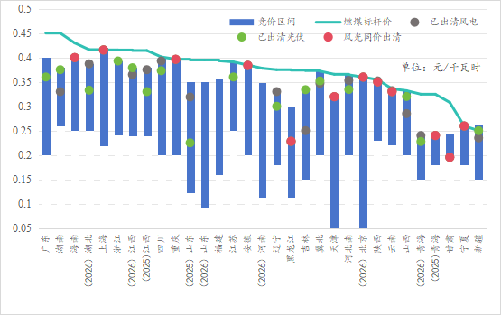 對(duì)于增量項(xiàng)目機(jī)制電價(jià),25地電價(jià)整體呈現(xiàn)“東高西低、中部均衡”的三檔格局。第一檔是東部高電價(jià)區(qū)(0.36-0.4元/千瓦時(shí)),以上海、江蘇、浙江、廣東為代表。第二檔是中部均衡區(qū)(0.32-0.38元/千瓦時(shí)),涵蓋山西、江西、湖南、重慶等地。第三檔是西部低電價(jià)區(qū)(0.195-0.26元/千瓦時(shí)),包括甘肅、寧夏、新疆等西北省區(qū)。第一檔全國最高價(jià)的上海和第三檔全國最低價(jià)的甘肅價(jià)差超0.3元/千瓦時(shí)。風(fēng)、光出清價(jià)格不同的地區(qū)有11個(gè),價(jià)差最大的是山東,僅湖南、冀北兩地光伏出清價(jià)格高于風(fēng)電。從競(jìng)價(jià)區(qū)間與燃煤標(biāo)桿電價(jià)維度來看,有14個(gè)地區(qū)競(jìng)價(jià)上限較燃煤標(biāo)桿電價(jià)下降,平均降幅約11%。從競(jìng)價(jià)區(qū)間與最終出清價(jià)格的維度來看,僅甘肅按競(jìng)價(jià)下限出清,其他多數(shù)地區(qū)出清價(jià)格位于競(jìng)價(jià)區(qū)間的中偏上區(qū)間,競(jìng)價(jià)上限較高的區(qū)域出清價(jià)格也較高。