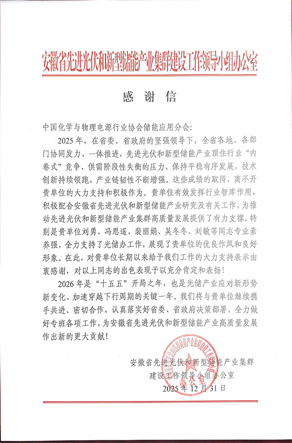 感謝信高度肯定了中國化學與物理電源行業(yè)協(xié)會儲能應用分會有效發(fā)揮行業(yè)智庫作用,積極配合安徽省先進光伏和新型儲能產(chǎn)業(yè)研究及有關工作,為推動先進光伏和新型儲能產(chǎn)業(yè)集群高質量發(fā)展提供了有力支撐。