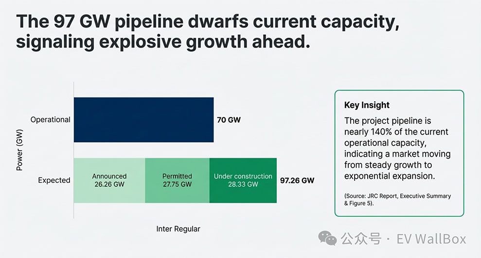 你上傳的材料給出一個非常直接的結論:歐洲現役儲能約70GW,但已規(guī)劃的項目管線約97.26GW,相當于現役規(guī)模的接近1.4倍——這不是“增長”,而是“擴容潮的排隊名單”。