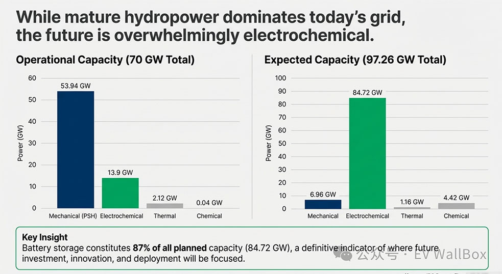 未來結構則幾乎被電化學改寫:計劃容量97.26GW中,電化學約84.72GW,占比約87%;機械儲能下降到約6.96GW,熱儲能約1.16GW,化學儲能約4.42GW。