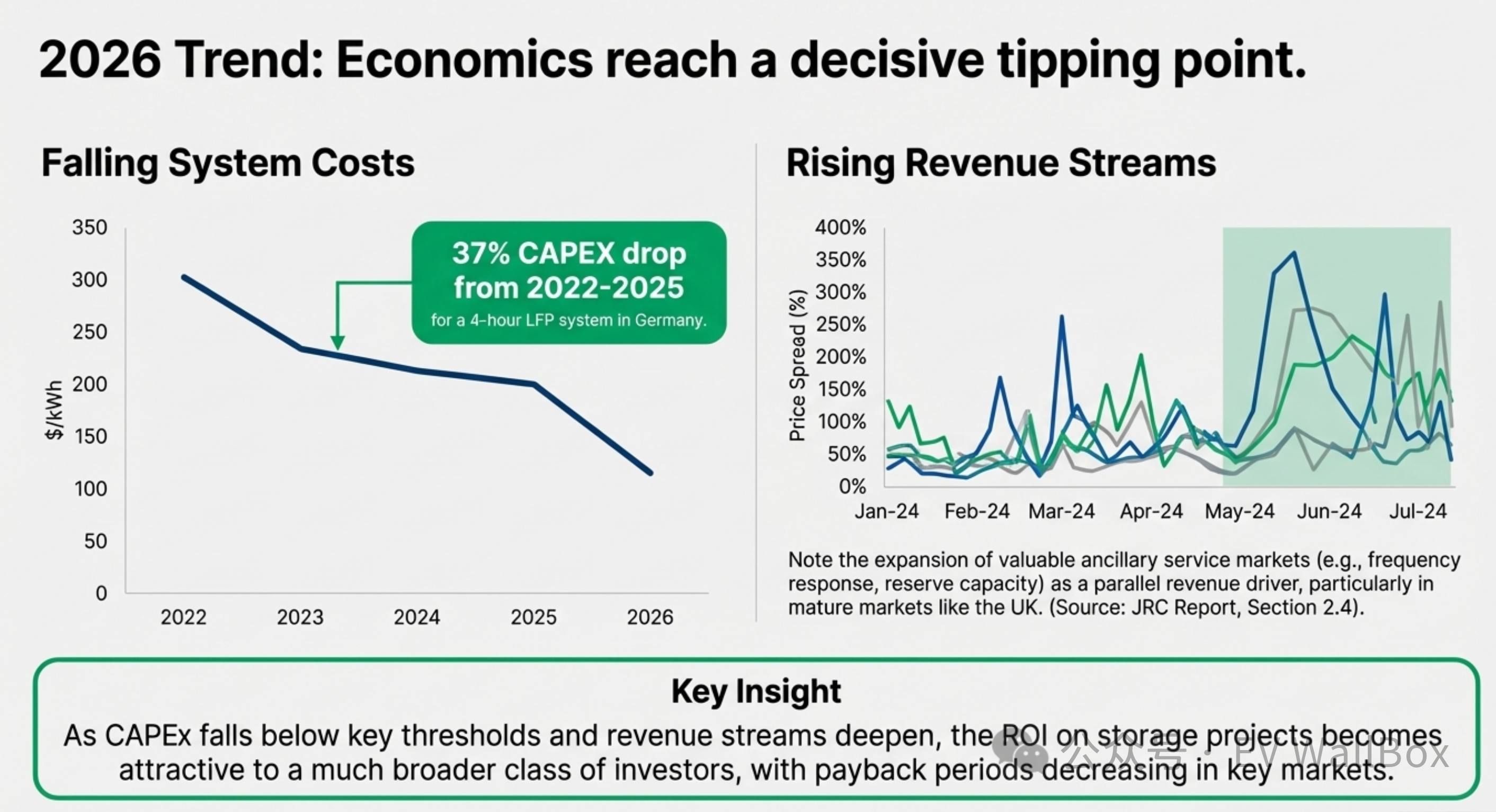 材料給出一個非常典型的信號:以德國4小時LFP系統(tǒng)為例,2022–2025年CAPEX下降約37%。當資本開支(CAPEX)下降到某個閾值以下,儲能的投資人群會從“懂電力的少數”擴展到“追求穩(wěn)定現金流的多數”。