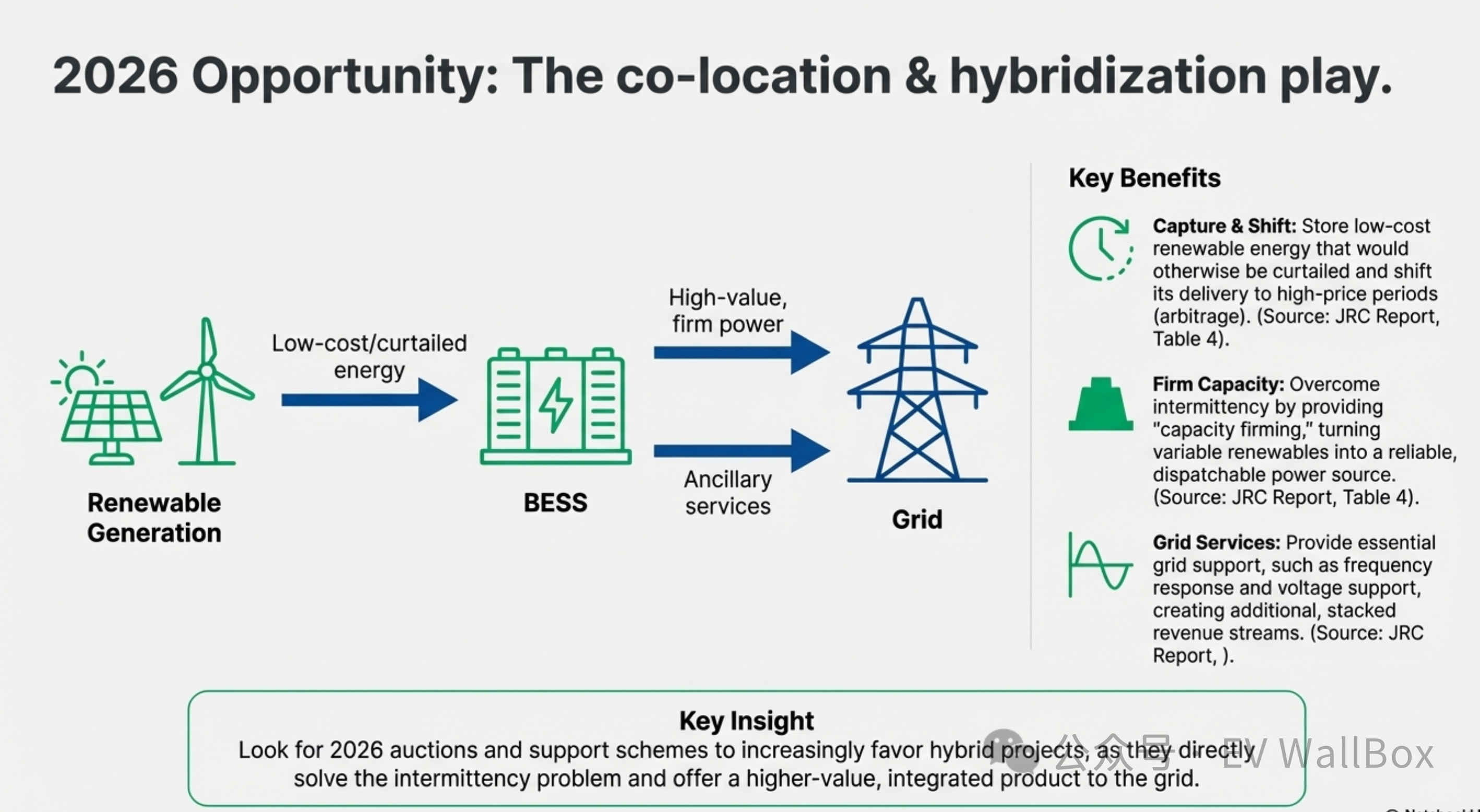 材料提出2026的重要機會是:共址與混合(Co-location & Hybridization)。典型模式是:風光(Renewable Generation)+ 電池(BESS)+ 并網點(Grid)一體化,三種價值疊加: