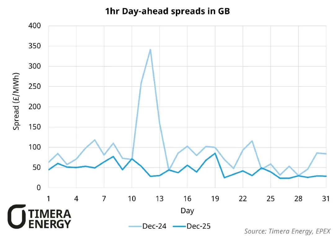 缺乏"風力沉寂期"引發(fā)的波動:2024年12月,一次明顯的"風力沉寂期"(低風力與高需求同時發(fā)生)導致系統(tǒng)收緊,顯著提高了價格波動性,日前價差達到約340英鎊/兆瓦時。而2025年12月的特點是冬季更為溫和,持續(xù)低風期較少,限制了波動性并壓低了價差,從而減少了電池儲能的套利空間。