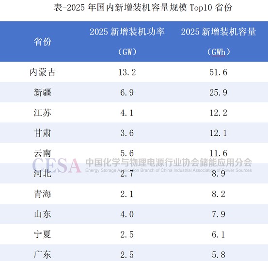 從國內(nèi)各省份來看,2025年,內(nèi)蒙古新型儲能新增裝機13.2GW/51.6GWh,容量占比為29.46%,領(lǐng)跑全國。新疆新增裝機6.9GW/25.9GWh,容量占比14.77%,位列全國第二;江蘇新增裝機4.1GW/12.2GWh,容量占比6.98%,居全國第三;甘肅新增裝機3.6GW/12.1GWh,容量占比6.9%,在全國排在第四。此外,云南新增裝機11.6GWh,河北、青海、山東、寧夏、廣東等省份新新增裝機均超過5GWh。