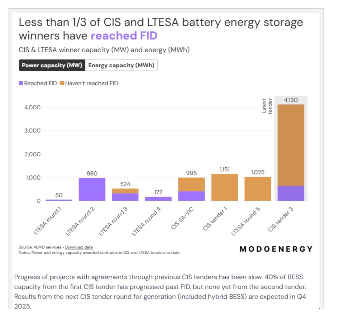 盡管澳大利亞政府為儲能項目開發(fā)提供了強有力支持,但許多項目仍推進緩慢。在容量投資計劃協(xié)議與長期能源服務(wù)協(xié)議框架下中標超過18個月的電池儲能項目(如南澳大利亞州和維多利亞州容量投資計劃項目)中,超過三分之二的項目尚未完成融資。