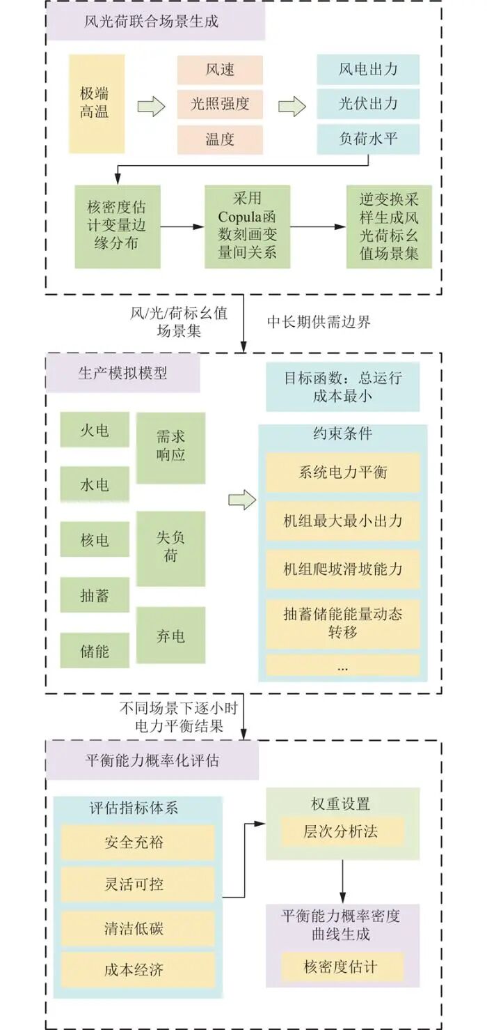國內外針對供需平衡能力評估已開展相關研究。場景生成方面,Copula函數因能刻畫風光的非線性耦合關系而被廣泛采用,如采用核密度與Copula構建風光聯(lián)合分布,采用Vine Copula處理多變量極端場景。電力系統(tǒng)生產模擬模型方面,包括隨機優(yōu)化、多階段動態(tài)規(guī)劃等方法,以最小化運行成本為目標,統(tǒng)籌優(yōu)化機組出力與靈活性資源調度。評估體系方面,層次分析法與核密度估計相結合的方法在配電網風險評估中已有應用。然而,現有方法中,場景生成僅考慮風光互補,忽略了負荷與風光的非線性時空依賴特征,隨機生產模擬模型在極端高溫場景下的應用還不充分,供需平衡能力評估指標缺乏對靈活性、低碳性、經濟性的綜合考慮。