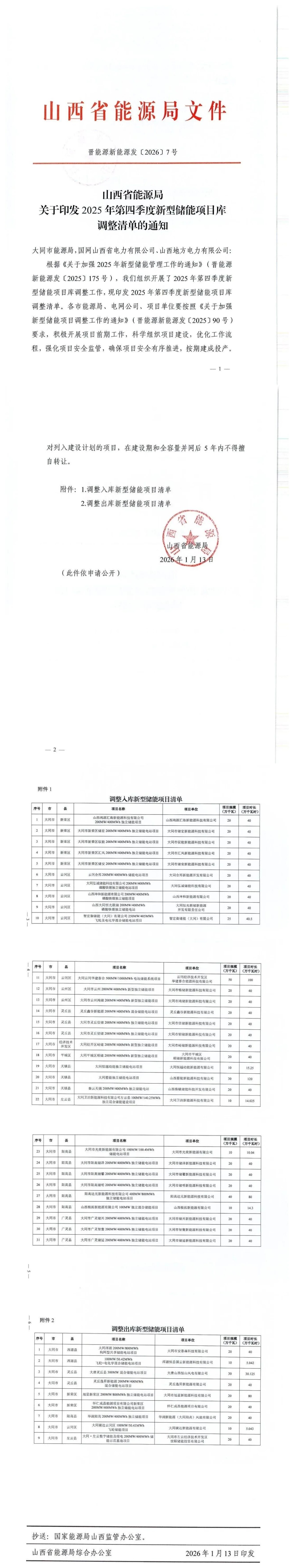 中國儲(chǔ)能網(wǎng)訊: 2026年1月13日,山西省能源局發(fā)布關(guān)于印發(fā)2025年第四季度新型儲(chǔ)能項(xiàng)目庫調(diào)整清單的通知公示文件。