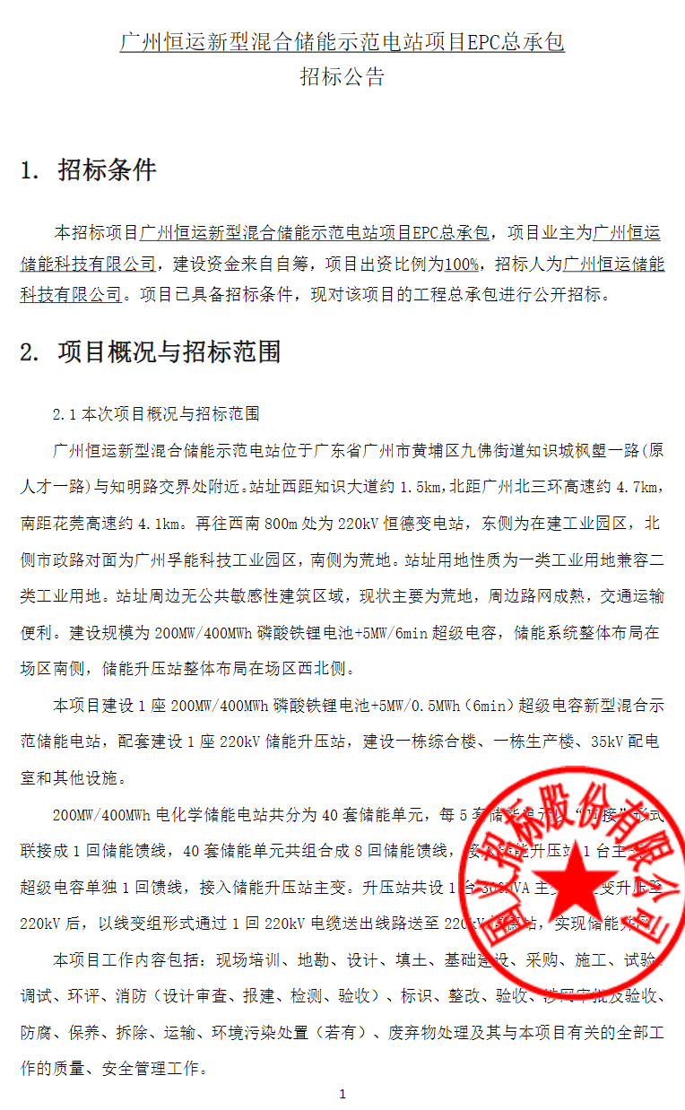 中國(guó)儲(chǔ)能網(wǎng)訊:2026年1月17日,廣州恒運(yùn)儲(chǔ)能科技有限公司發(fā)布廣州恒運(yùn)新型混合儲(chǔ)能示范電站項(xiàng)目EPC總承包招標(biāo)公告,建設(shè)資金來(lái)自自籌,項(xiàng)目出資比例為100%,計(jì)劃總工期為300個(gè)日歷天。