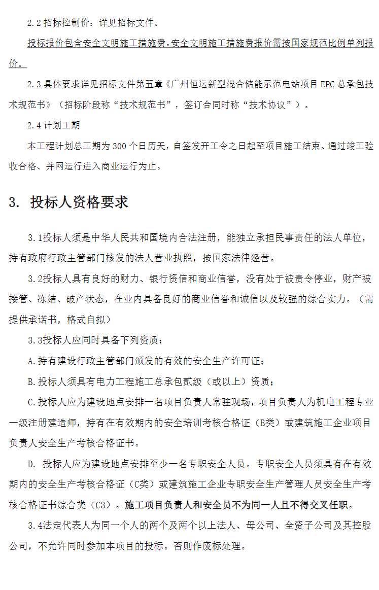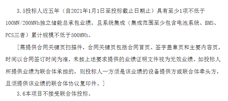 項(xiàng)目要求投標(biāo)人近五年具有至少1項(xiàng)不低于100MW/200MWh獨(dú)立儲(chǔ)能總承包業(yè)績(jī),且系統(tǒng)集成(集成范圍至少包含電池系統(tǒng)、BMS、PCS三者)累計(jì)規(guī)模不低于500MWh。