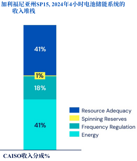 一個 4 小時電池的年收入結(jié)構(gòu)并不“純靠價差”,在這個例子里,資源充足性(Resource Adequacy)與移峰填谷能量(Energy)各占約41%,調(diào)頻(Frequency Regulation)約18%,旋轉(zhuǎn)備用(Spinning Reserves)約1%。