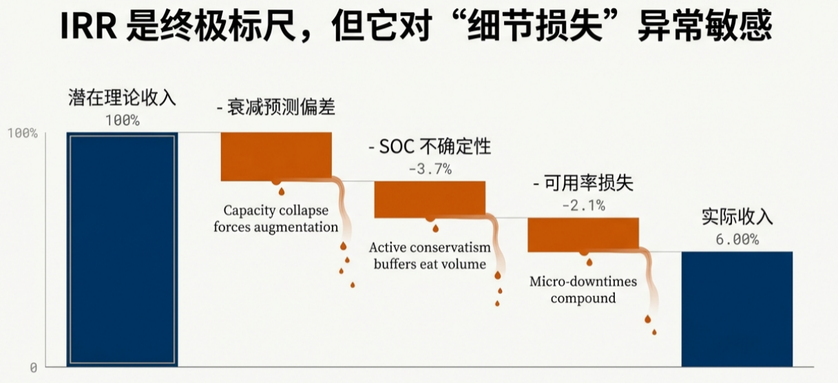 可用率少一兩個百分點、可調(diào)度能量少一兩個百分點、SOC誤差迫使你長期“留富余”少賣一兩個百分點,都會在資產(chǎn)壽命里復(fù)利式放大,最終把“看起來并不大”的偏差,演化成融資端不可忽視的現(xiàn)金流斷崖。