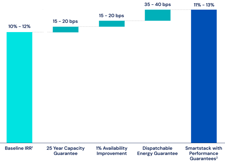 基線收益IRR約10%–12%;再疊加25 年容量保證、可用率提升 1 個百分點,以及“可調(diào)度能量保證(Dispatchable Energy Guarantee)”之后,股權(quán) IRR 預(yù)計可增加約65–80個基點(bps)。