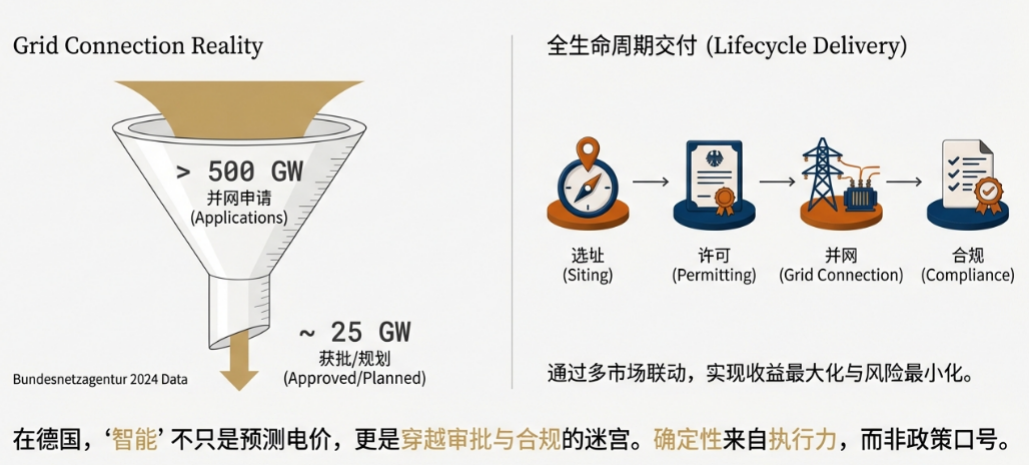 這恰恰說明,在德國把儲能做聰明并不是把電價預(yù)測得更準(zhǔn),而是把項目從選址、許可、并網(wǎng)、系統(tǒng)服務(wù)到結(jié)算合規(guī)這一整條鏈條做得更“可交付”。