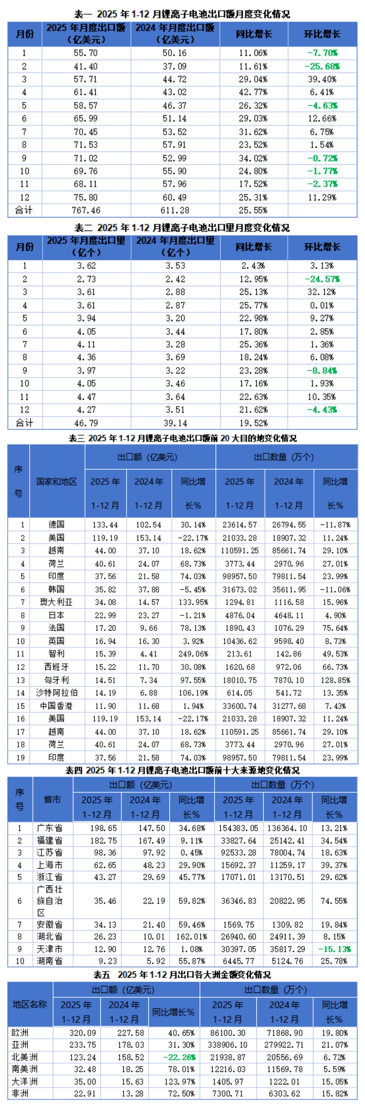 出口市場結構在2025年發(fā)生標志性變化:歐洲取代北美成為最大出口市場,而“一帶一路”等新興市場則成為增長新引擎。歐洲市場(以德國為核心)強勢登頂這主要得益于歐洲激進的能源轉型政策,帶動了電動汽車和家庭儲能的旺盛需求。而北美市場(以美國為主)顯著收縮:對美國出口額全年同比下降22.17%。這主要是受美國加征關稅等貿(mào)易壁壘政策的直接影響。一些企業(yè)為規(guī)避風險,曾在前幾個月出現(xiàn)“搶出口”行為,透支了后續(xù)需求。另外,2025年,呈現(xiàn)出新興市場快速崛起。除了因?qū)γ绹隹陬~較大幅度下降而導致對北美洲出口同比有22.26%的降幅以外,對其他各洲出口均實現(xiàn)了超過30%的增長。越南不僅躍升為第三大市場,智利、澳大利亞、沙特阿拉伯等國的進口額也出現(xiàn)驚人增長。這反映了中國鋰電企業(yè)積極推行市場多元化戰(zhàn)略以分散風險。