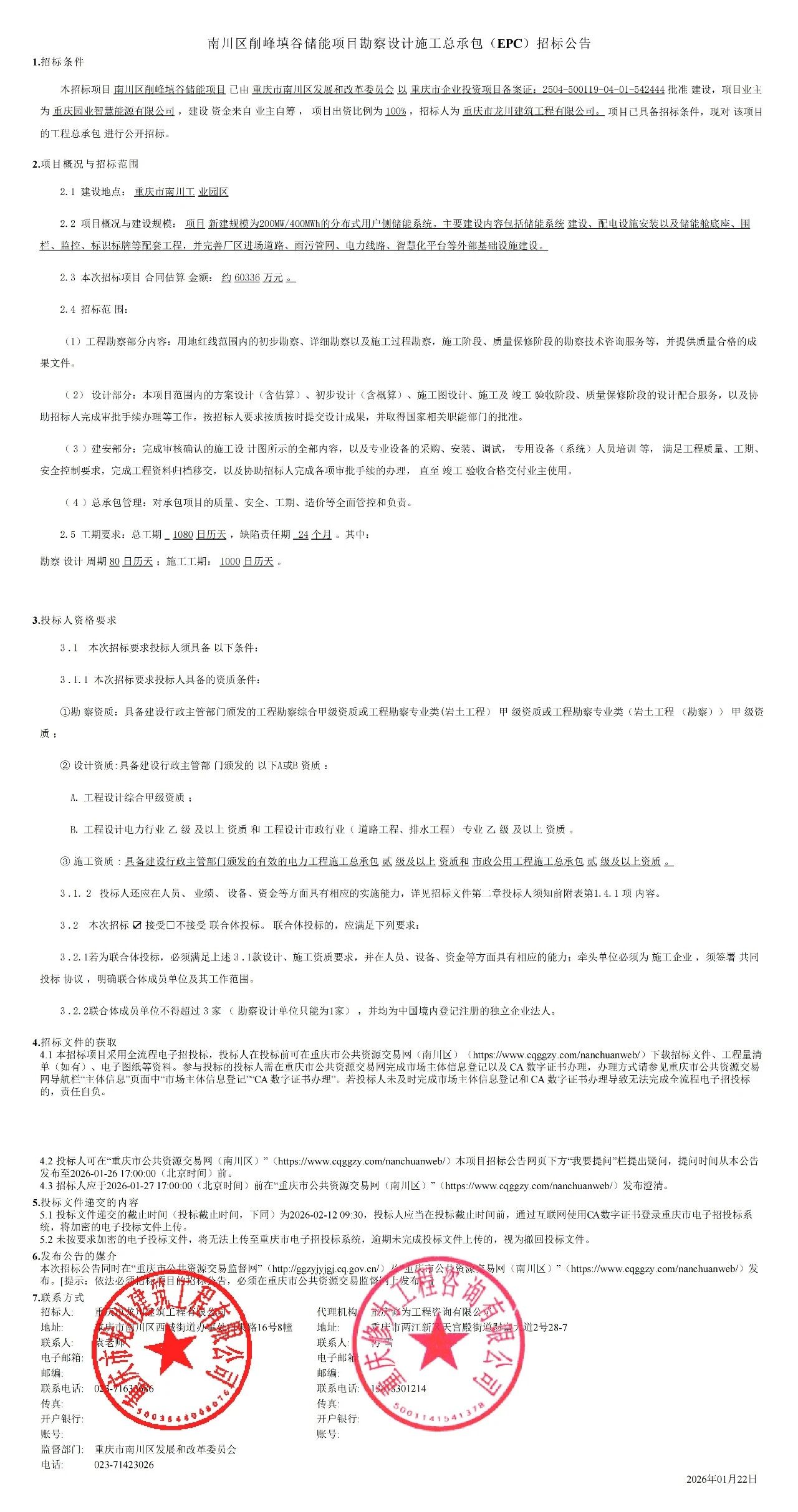 中國儲(chǔ)能網(wǎng)訊:1月22日,重慶南川區(qū)削峰填谷儲(chǔ)能項(xiàng)目勘察設(shè)計(jì)施工總承包(EPC)招標(biāo)公告。項(xiàng)目新建規(guī)模為200MW/400MWh的分布式用戶側(cè)儲(chǔ)能系統(tǒng)。項(xiàng)目合同估算金額約60336萬元,折合單價(jià)1.51元/Wh。