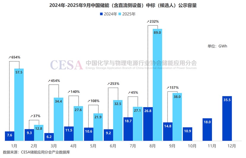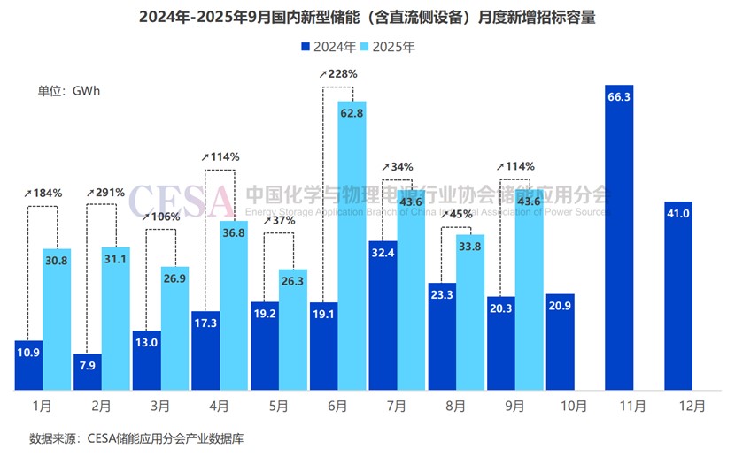 據(jù)CESA儲(chǔ)能應(yīng)用分會(huì)產(chǎn)業(yè)數(shù)據(jù)庫(kù)不完全統(tǒng)計(jì),2025年9月國(guó)內(nèi)新增268個(gè)儲(chǔ)能招標(biāo)項(xiàng)目,其中EPC(含直流側(cè)設(shè)備)和儲(chǔ)能系統(tǒng)采購(gòu)總規(guī)模達(dá)14.8GW/43.6GWh,容量規(guī)模同比增長(zhǎng)114%,環(huán)比增長(zhǎng)29%。