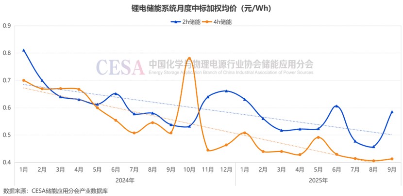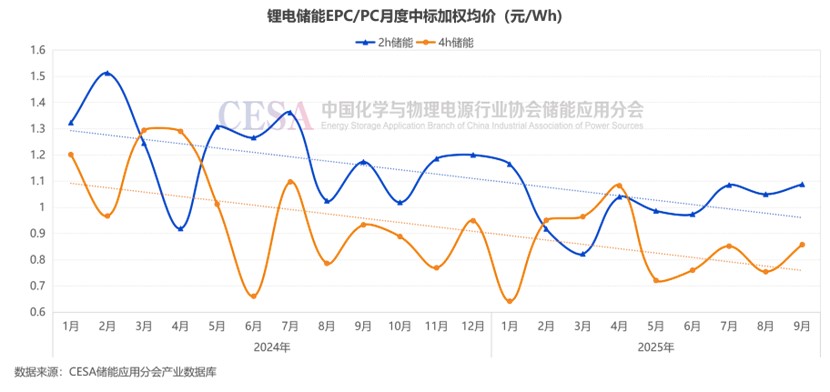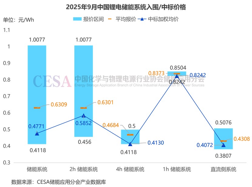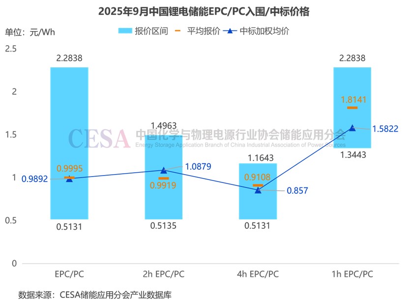 2025年9月,鋰電儲(chǔ)能EPC/PC(不含工商業(yè)儲(chǔ)能柜EPC)入圍報(bào)價(jià)主要集中在0.5131-2.2838元/Wh區(qū)間內(nèi),平均價(jià)格0.9995元/Wh,中標(biāo)加權(quán)均價(jià)0.9892元/Wh,環(huán)比+17.57%。
