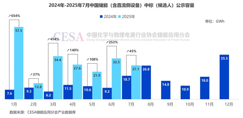 2025年1-7月,儲(chǔ)能集采/框采類(lèi)中標(biāo)(候選人)公示規(guī)模70.92GWh,其中儲(chǔ)能電芯7.8GWh,儲(chǔ)能系統(tǒng)集采/框采落地63.12GWh。